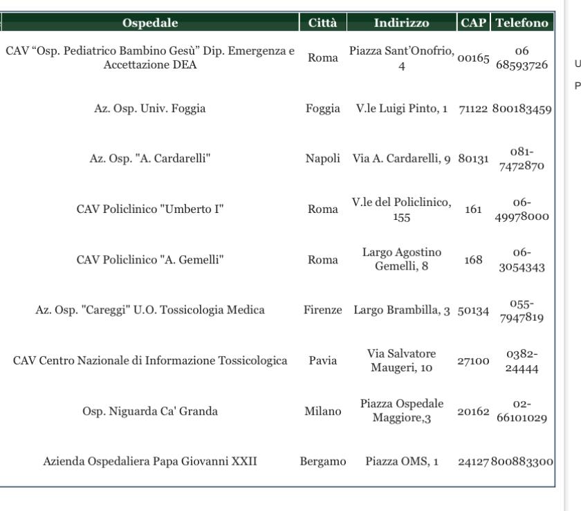 “La stagione dei funghi è appena iniziata –- eppure in pochi giorni al nostro Centro abbiamo le segnalazioni negli ultimi 5 giorni. Di funghi velenosi si muore, come nel caso dei funghi riconducibili alla famiglia delle amanite, ma sono anche molte altre le specie velenose la cui ingestione può causare danni epatici fino ad arrivare ad epatiti fulminanti e danni renali e neurologici. È importante, se reperiti autonomamente o avuti in regalo, avere una certificazione prima del consumo, che le Asl forniscono gratuitamente”. In presenza di una sospetta intossicazione occorre chiamare subito uno dei 10 centri antiveleni presenti in altrettante regioni italiane (vedi tabella) che forniscono supporto specialistico 24 ore su 24, incluso i giorni festivi.